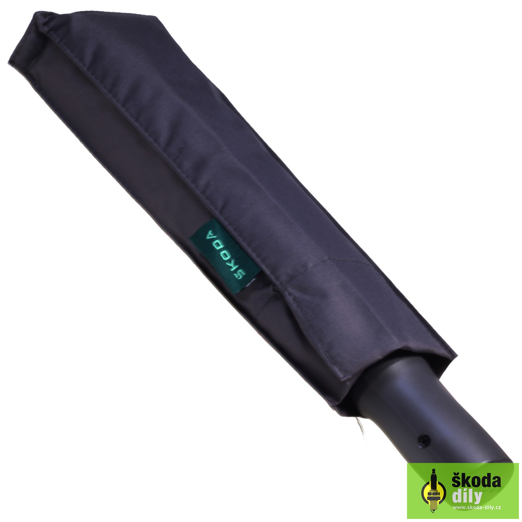 Vystreľovací dáždnik, rukoväť s logom Škoda, v zloženom stave presne pasuje do priehradky vo dverách, čierny.