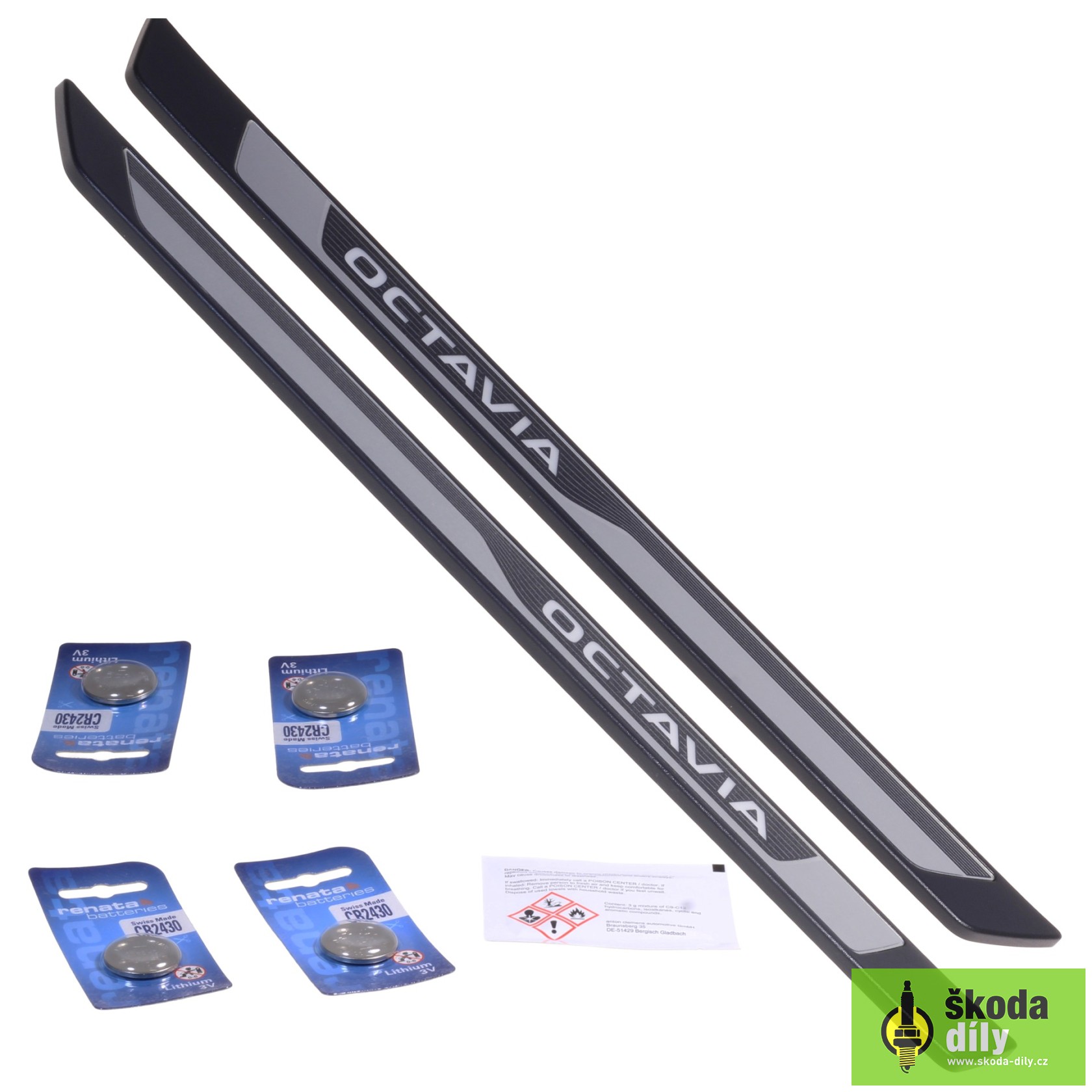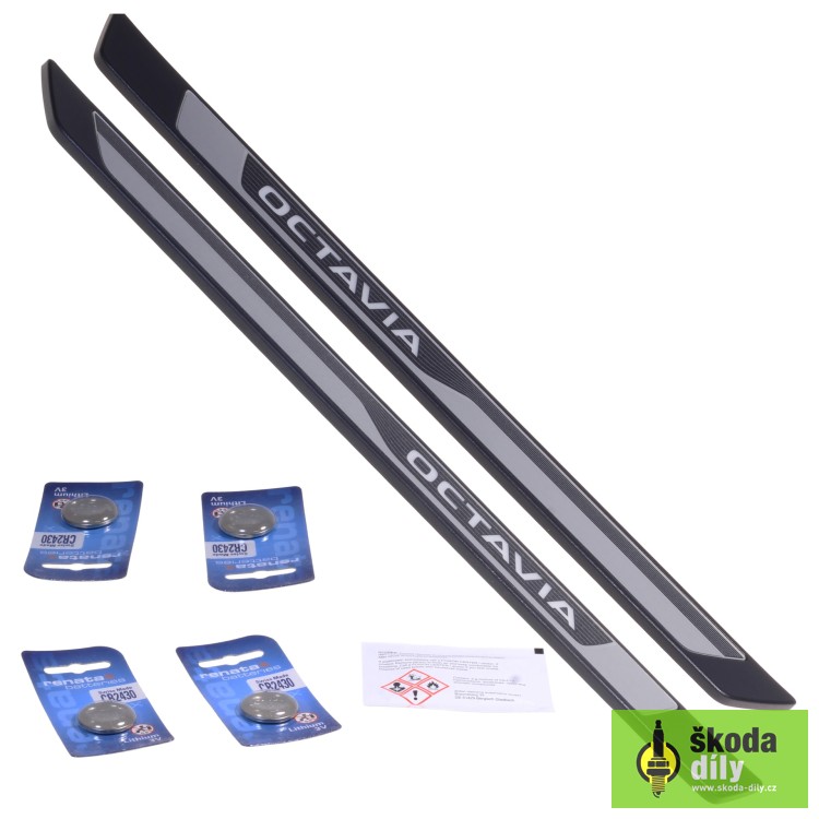 Sada 2ks osvetlených dekoratívnych prahových líšt s nápisom "Octavia". Chráni prahy pred poškodením od topánok cestujúcich pri nastupovaní a vystupovaní.