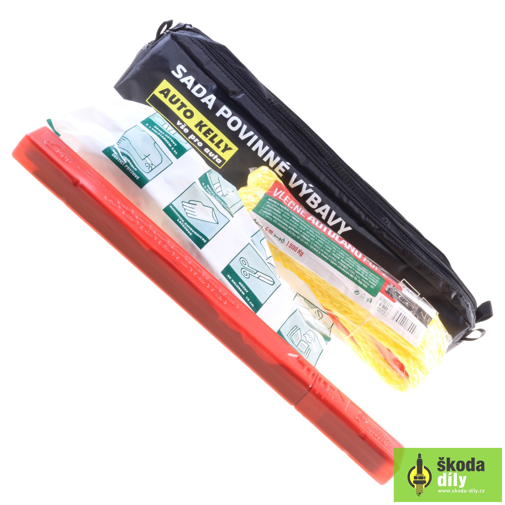 obsah balenia: výstražný trojuholník, ťažné lano, autolekárnička podľa vyhlášky 182/2011