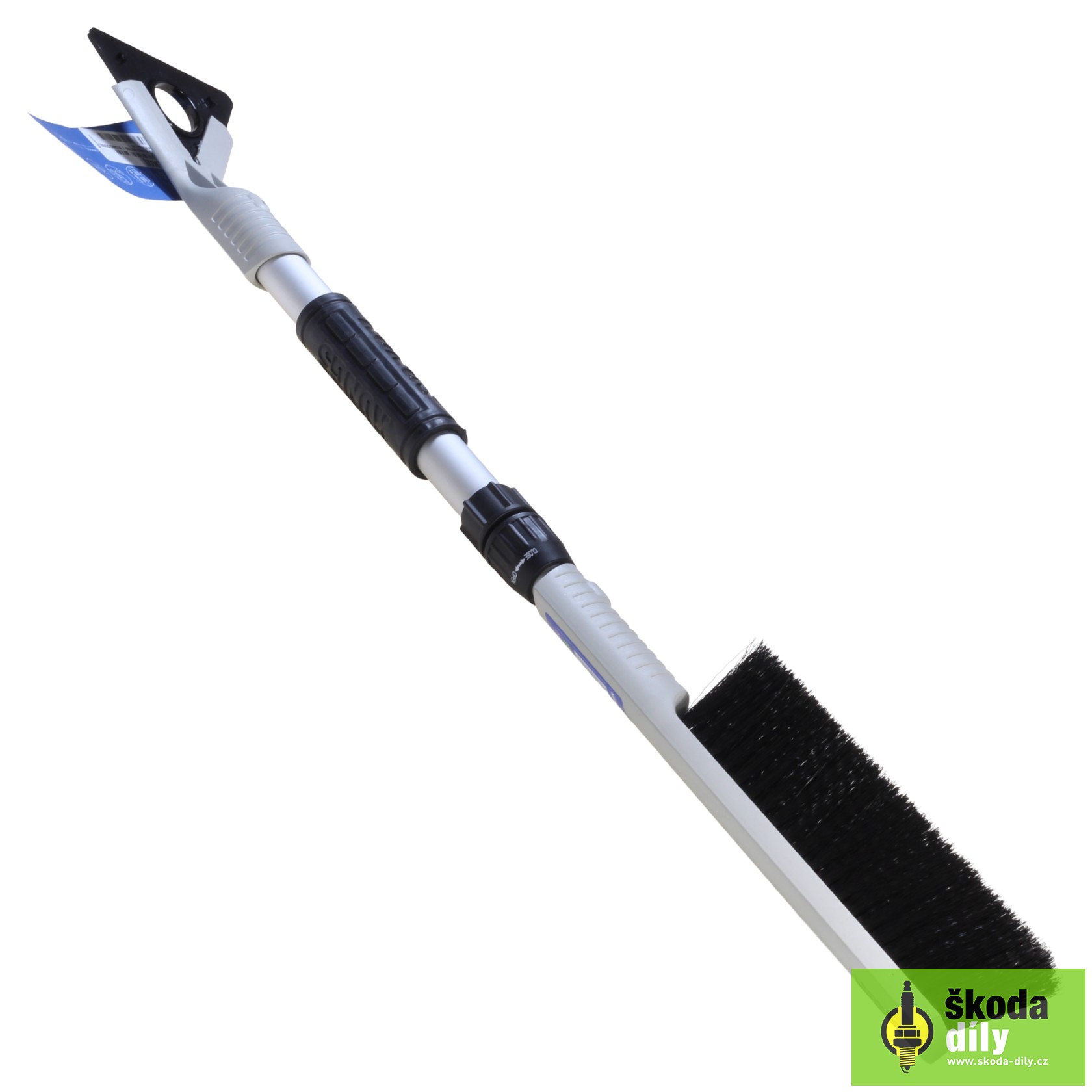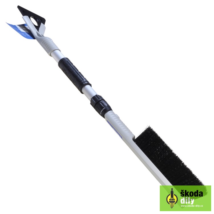 Teleskopická škrabka sa zmetákom na odstránenie námrazy a snehu z automobilu. Brit možné použiť zo všetkých troch strán čo predlžuje životnosť, v jednom rohu britu je výrez pre očistenie gumičiek stieračov.